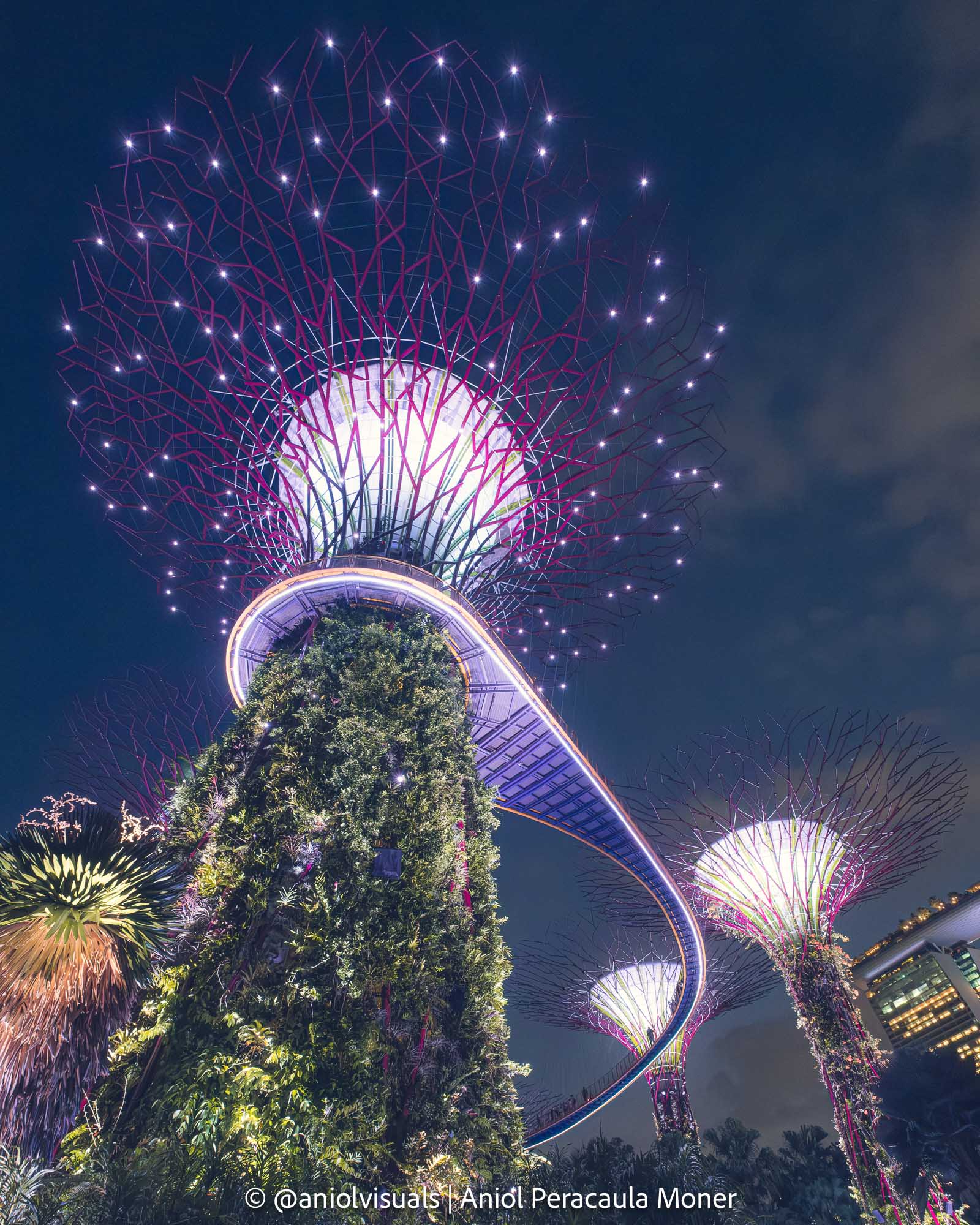 The Gardens by the Bay are another of the most visited areas of Marina Bay. Without any doubt, the best moment to visit them is at night, when the lights and music show happens. It is not easy to take good or unique photos. I struggled a lot with the tree structures, as it was difficult to get great compositions. The trees overlap with others, there are a lot of people,… I would recommend being there beforehand, testing one or multiple locations and then shooting.