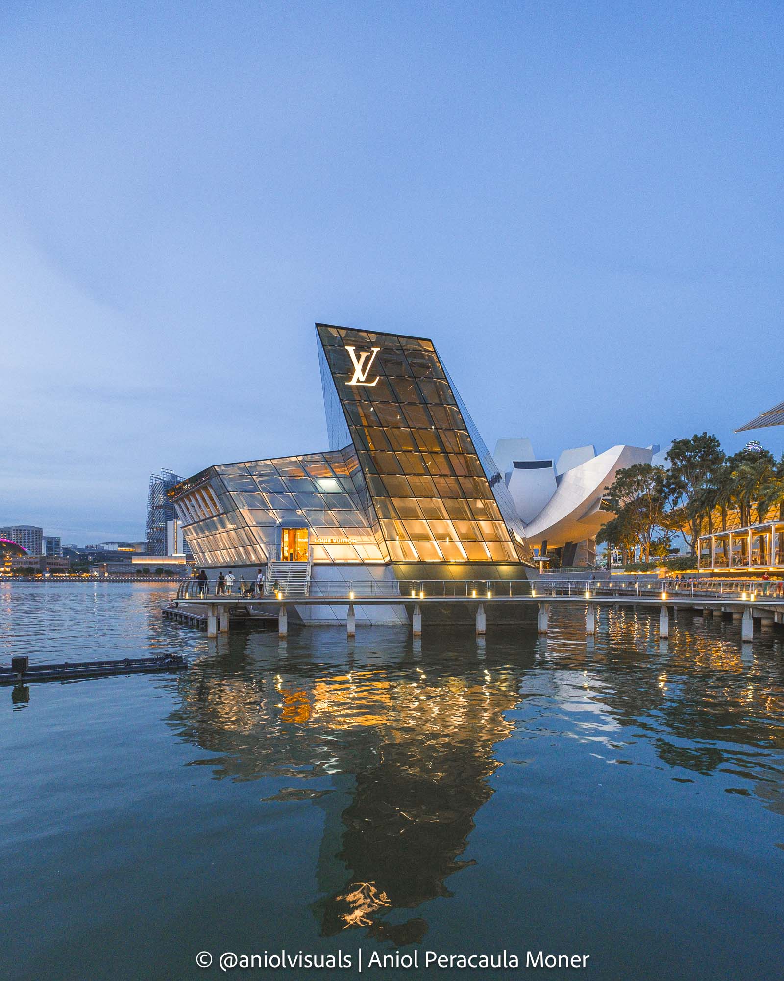 Another interesting building very close to Marina Bay Sands Apple store is the Louis Vuitton store. The building has a very characteristic shape, it almost looks like the L of LV, the logo of the brand. Like the Apple Store, it is located in the water, and it’s possible to capture it with a nice reflection. It can be difficult to isolate it from the Art Science museum, but it’s a cool spot.